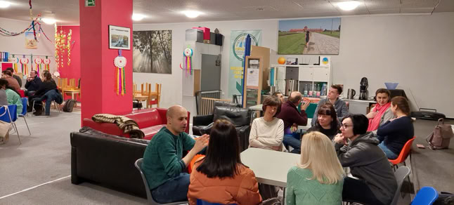Das regelmäßige Treffen richtet sich an Menschen aller Sprachniveaus von Anfängern bis A1 und B2 und bietet eine Vielzahl von Übungen, darunter Wortschatzübungen, kommunikative Spiele, Redewendungen und Mini-Dialoge, die auf alltägliche Situationen abzielen, wie Einkaufen, Wohnen, Verabredungen treffen und mehr.