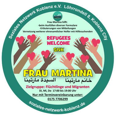 Jeden Dienstag von 17:00 bis 19:00 haben sich Menschen zusammengefunden, die ehrenamtlich helfen möchten Flüchtlinge weiterhin zu unterstützen. Ungeachtet der Herkunft oder Religion helfen wir mit Beratung (auch muttersprachlich), wir begleiten zu Behörden ( zB. Ausländerbehörde) und Ärzten, Mobilfunkanbieter oder Vermietern. Auch Transporte können organisiert werden. Ehrenamtliche Helfer spielen eine wichtige Rolle dabei, Flüchtlinge und Asylsuchende mit der Gemeinschaft zu verbinden und sich für eine integrativere und vielfältigere Gesellschaft einzusetzen.